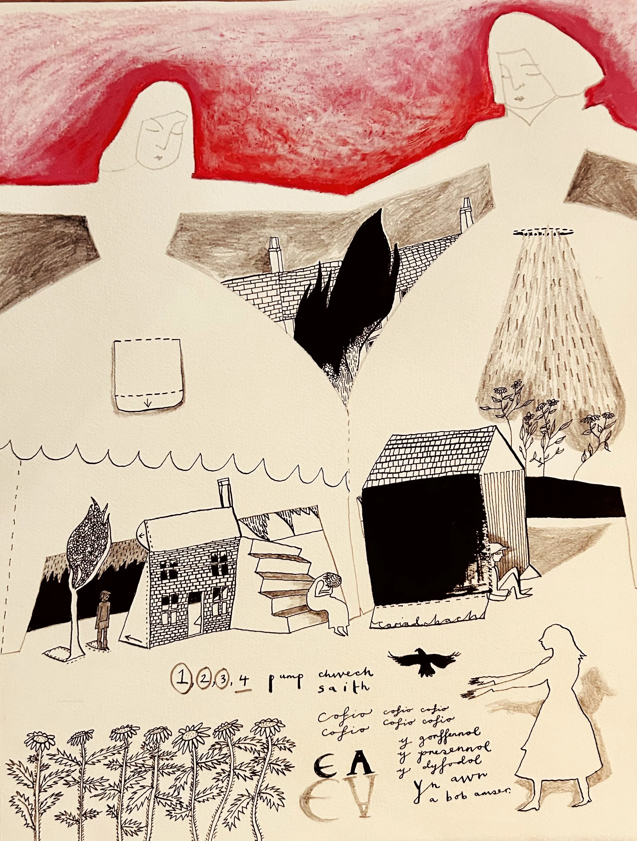‘cofio pan’ [remember when] dip pen ink pencil and Stabilo crayon on watercolour paper